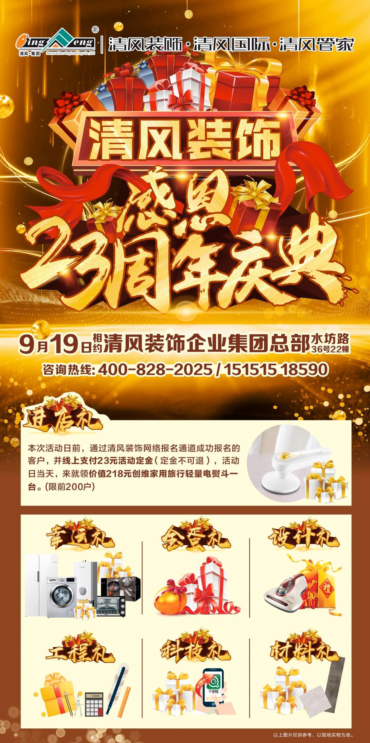 本次活動(dòng)日前(即2021年9月1日-9月18日期間),通過(guò)清風(fēng)裝飾網(wǎng)絡(luò)報(bào)名通道成功報(bào)名的客戶,并線上支付23元活動(dòng)定金(定金不可退),活動(dòng)日當(dāng)天(即2021年9月19日),來(lái)就領(lǐng)價(jià)值218元?jiǎng)?chuàng)維家用旅行輕量電熨斗一臺(tái)(限前200戶;每戶客戶限領(lǐng)一臺(tái);禮品僅限活動(dòng)日當(dāng)天領(lǐng)取,過(guò)期作廢。)