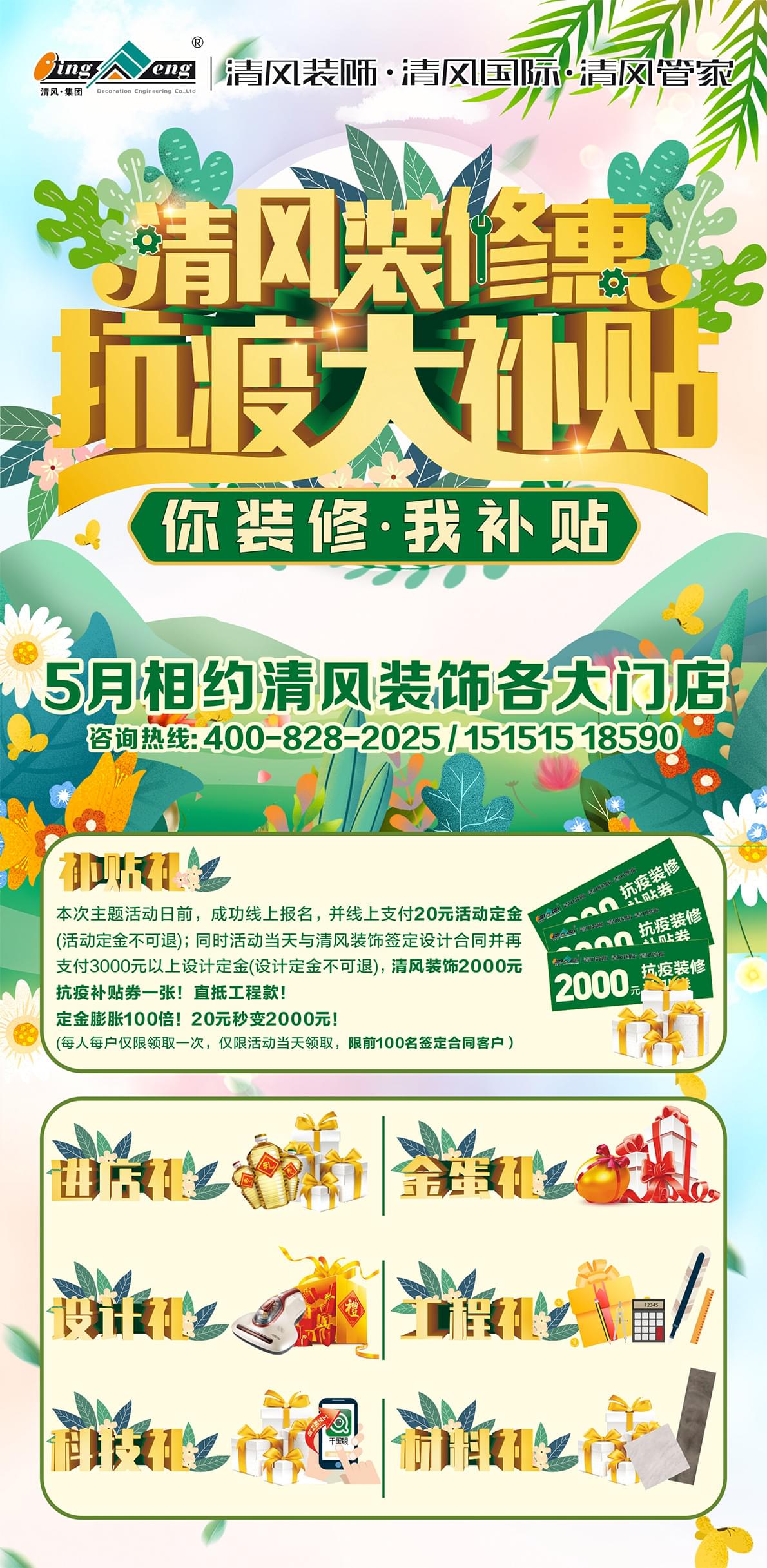 本次主題活動周期內(nèi)(即2022年5月1日-5月31日期間),通過清風(fēng)裝飾網(wǎng)絡(luò)報名通道成功報名的客戶,并線上支付20元活動定金(活動定金不可退);同時與清風(fēng)裝飾簽定設(shè)計合同并再支付3000元以上設(shè)計定金(設(shè)計定金不可退),即可領(lǐng)取清風(fēng)裝飾2000元抗疫補貼券一張!直抵工程款!定金膨脹100倍!20元秒變2000元?。咳嗣繎魞H限領(lǐng)取一次,僅限活動周期內(nèi)領(lǐng)取,僅限前100名簽定合同客戶。)